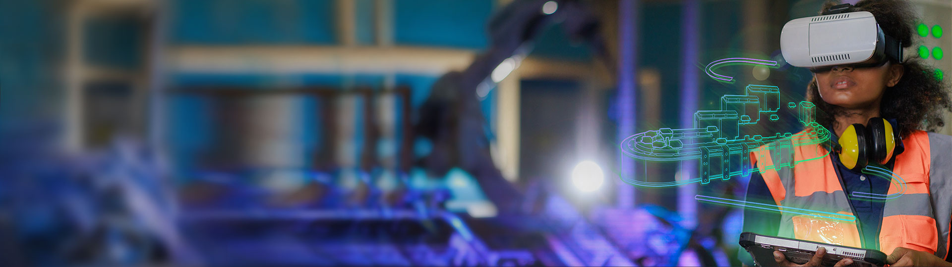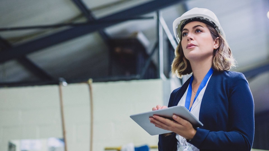 • A person and person wearing hard hats looking at a tablet