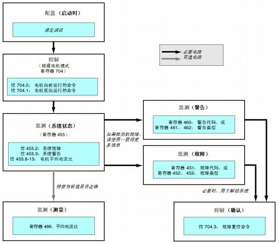 使用通讯控制TesysT时,寄存器704不同的位可以实现正反转、复位等控制,寄存器455不同的位可以实现控制器状态的监视。简单运行需要使用的寄存器如下图所示: