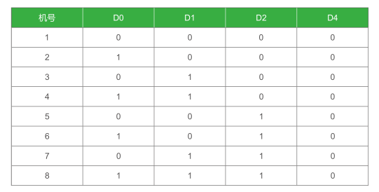 拨码开关有效位是 1 ~ 3 位,D4 位必须设置为0(off位),第一个模块拨码地址必须从0开始,往后依次按顺序设置,不能跳。拨码开关与机号之间的关系用二进制表示,1代表on、0代表off,如下表所示: