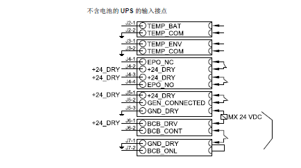 (1)电池开关信号线接线参照下图,脱扣线圈正极接J6-1,负极接J5-3;辅助触点取NO常开点信号, 连接到UPS的J6-2和J7-1端子。