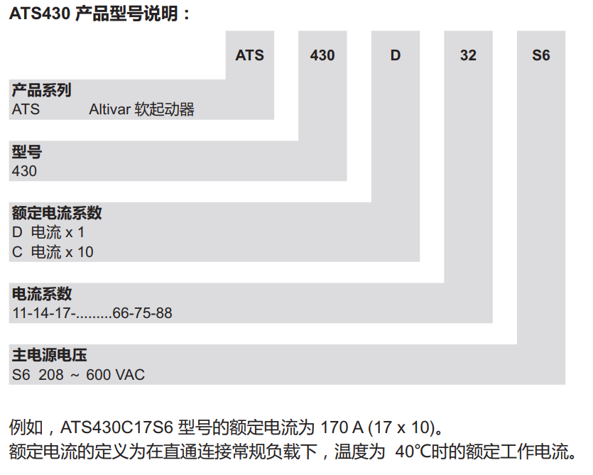 ATS430软起动器的型号命名规则如下: