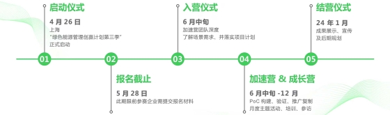施耐德电气作为全球能源管理领域的领导者,旨在以绿色能源管理理念和解决方案为客户提供支持,帮助他们轻松应对挑战,实现更大的增长空间,并降低转型成本。从能源生产、传输、存储到使用全生命周期中,我们希望实现可持续、高效、韧性、灵活的能源管理目标,成为各类型企业实现高效和可持续发展的数字合作伙伴,赋能所有人对能源和资源的最大化利用。为了推动能源产业的绿色低碳转型,从2021年起,绿色能源管理创赢计划集结了众多合作伙伴与创新力量,联合开展技术创新,共同构建本地生态圈,并不断为能源产业的绿色低碳转型贡献新方案。“绿色能源管理创赢计划”第三季开启报名,我们期待更多优秀的科创企业与合作伙伴加入我们,立足真实场景需求,共研共创更加高效的绿色能源管理解决方案。同时,科创企业团队也将有机会获得由施耐德电气及其合作伙伴提供的培训、产业资源深度对接、投资和其他业务合作机会,共同为中国能源产业的绿色、低碳发展和数字化转型升级带来更多积极影响,共赢可持续未来。活动时间 2023年4月-2024年1月